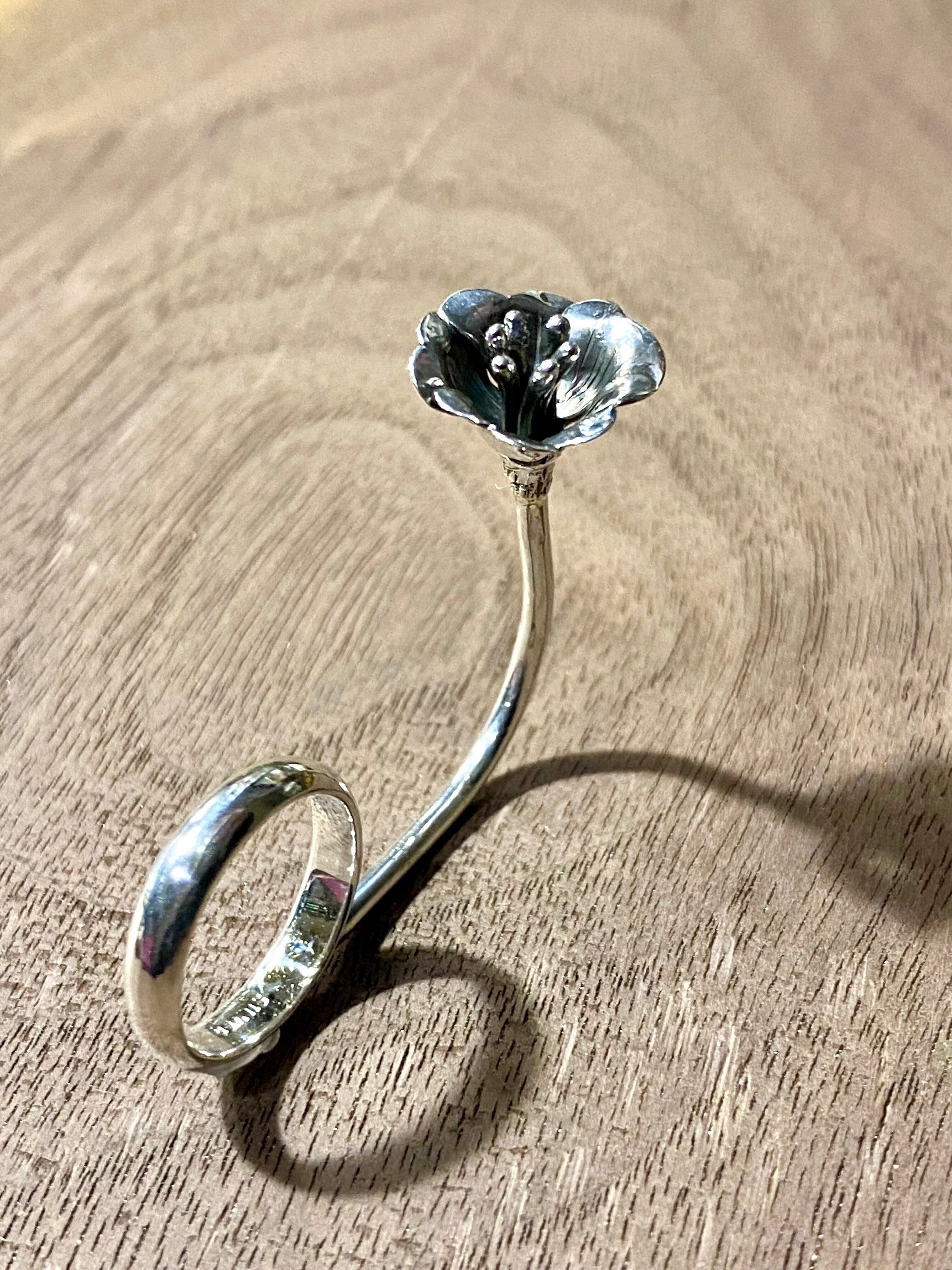 桜の花は横約15㍉、厚み約13㍉、silver線はφ2.0㍉で艶ありの反射が綺麗な作品です。