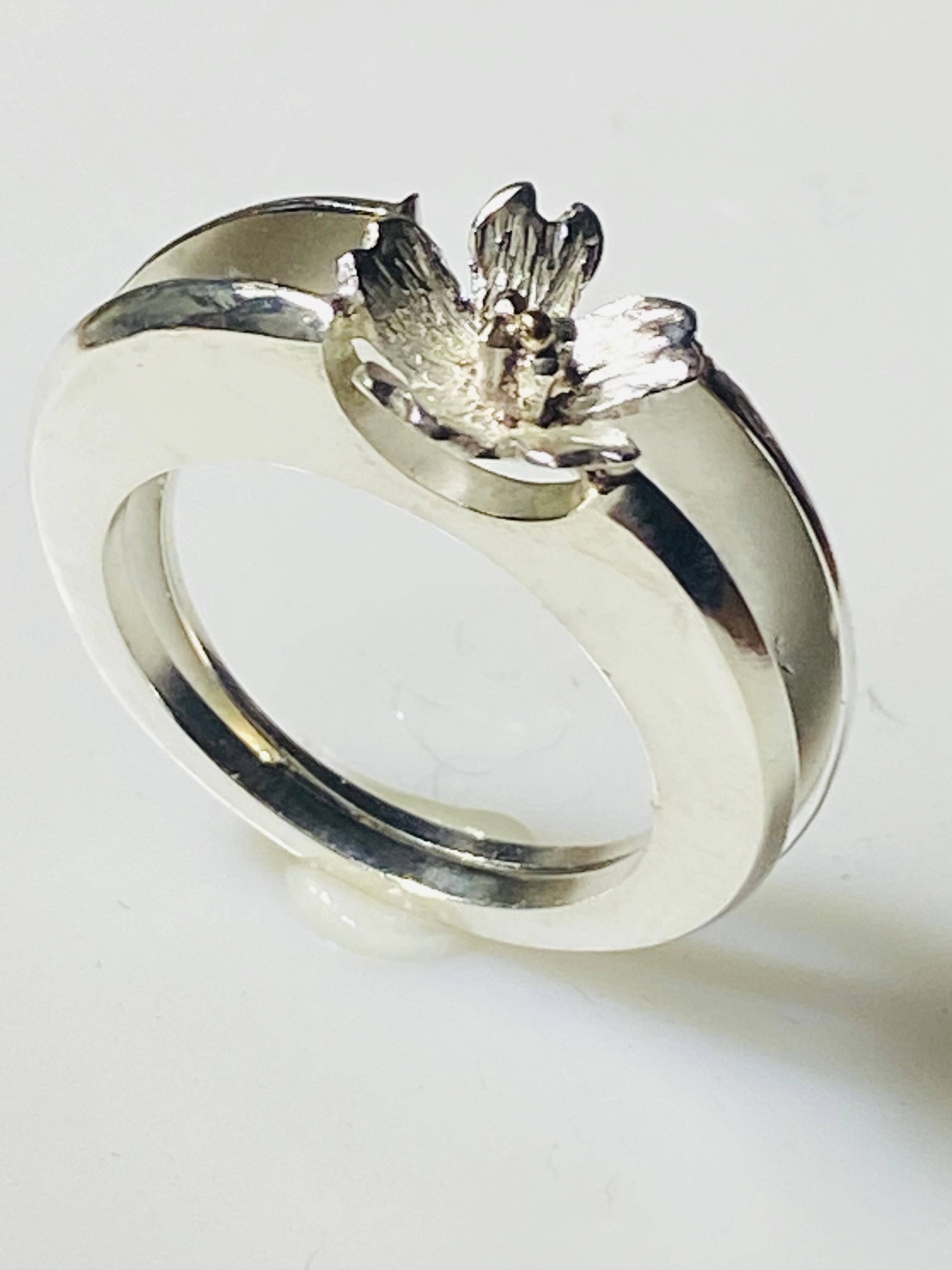 シルバーを溶かして塊にしてから鍛金、リング穴を開け、縦に切断、下部をロウ付けしてトップに桜を浮かせました。
