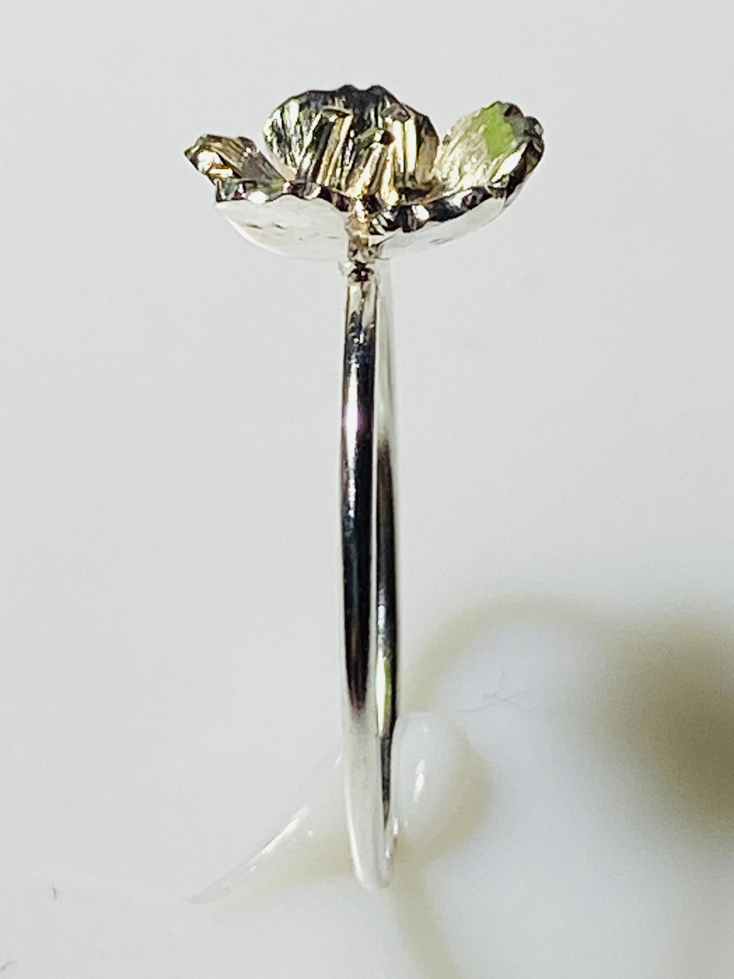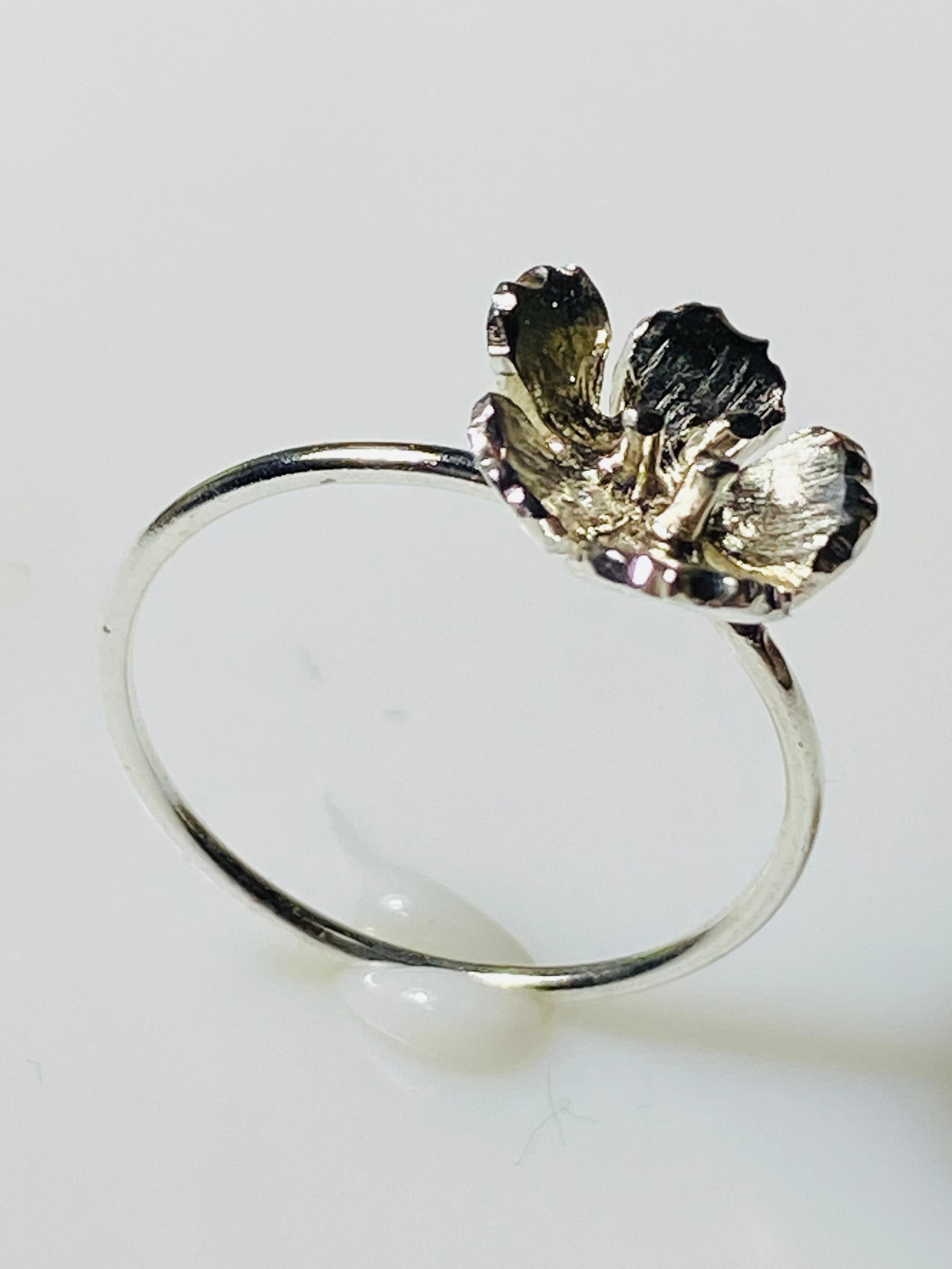 シルバー1.5㍉板を鍛金、桜を切り出ししました。華奢な1㍉線リングです,桜部分は直径約10㍉です。